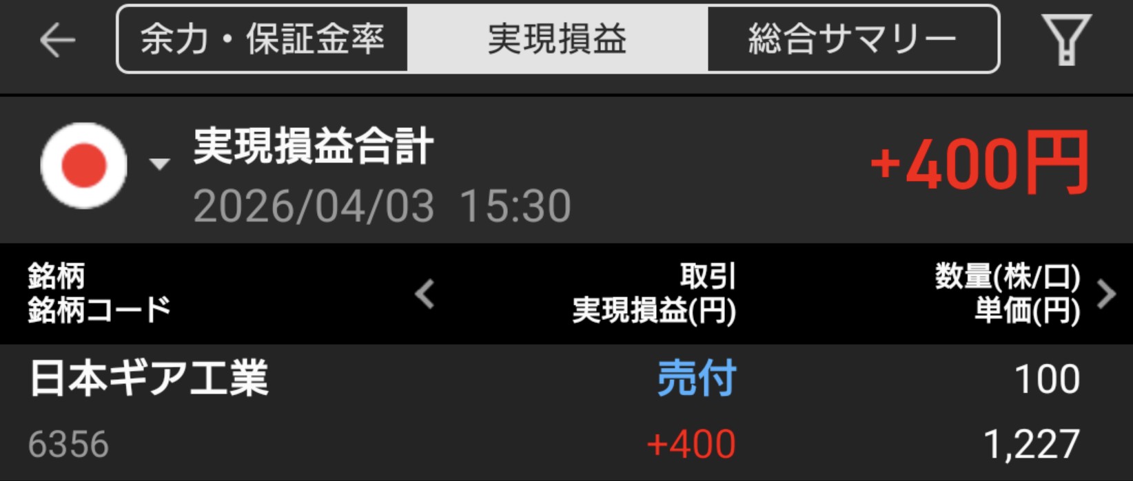 日本ギア工業のデイトレードでは、エントリーした時点で上昇の勢いが弱まりつつあるように感じていました。板の動きや値動きの細かな変化から「少し流れが変わってきているかもしれない」という違和感はあったものの、その感覚を判断に反映しきれず、売却まで時間がかかってしまいました。結果として判断がワンテンポ遅れ、今後の課題として意識したいポイントになりました。