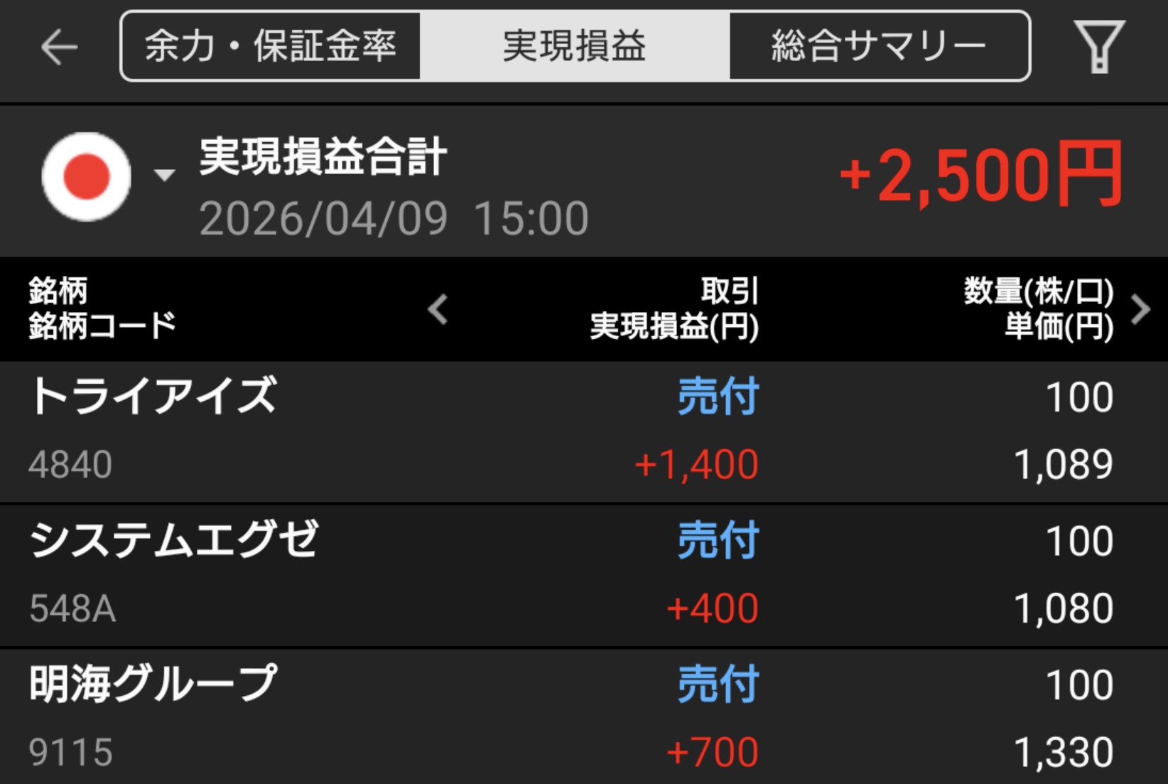 本日のデイトレでは、売買代金ランキングを基準に銘柄を選定しました。明海グループは比較的落ち着いた値動きでしたが、他2銘柄はやや荒い動きが見られました。それでもエントリーポイントは良く、短時間で利益を得ることができました。ただし、その後の値動きを見ると、利確のタイミングがやや早かったのではないかと感じています。